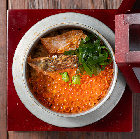 約8種類の釜めしをご用意。芳醇な味わいの「河内鴨ネギ釜めし」と贅沢な「うなぎとイクラの釜めし」は特におすすめ◎厳選した米と、鶏ガラからじっくり取った出汁を使用し、釜で炊き上げることでふわっと広がる出汁の香りが食欲をそそります。釜めしの後には、あっさりとした鰹出汁茶漬けで締めくくっていただけるのも嬉しいポイント。