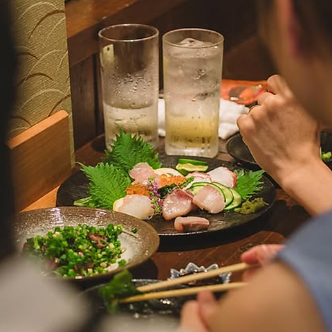 市場直送の新鮮なお刺身をはじめ、しっとり旨みが残るように下処理された大手羽の唐揚げ、甘味と味噌のコクが広がる赤ナス田楽、サクサクの揚げ物、〆にぴったりの釜めしなど様々な料理をご用意しております。どれもお酒との相性抜群◎お得な飲み放題付きコースもございますので、各種宴会などにご利用ください。