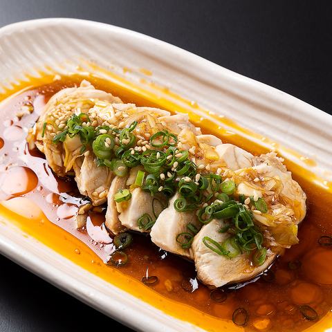 鶏たたきに、ピリ辛の特製中華ダレをたっぷりかけた一品。甘辛酸っぱいタレが後を引き、お酒との相性は抜群です
