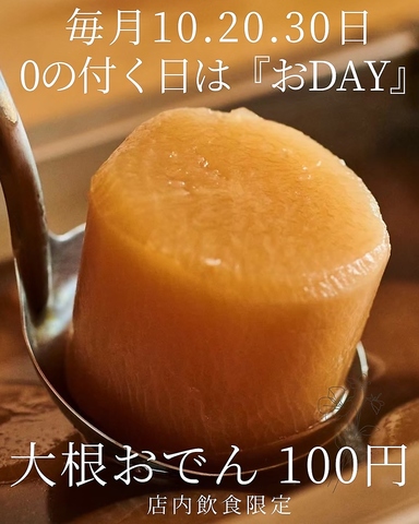 10.20.30日はおでんの日!当店自慢の大根おでんを終日100円でご提供します★(店内飲食のお客様限定)