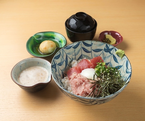 ●選べる温玉丼(まぐろ温玉丼・ネギトロ温玉丼・まぐろネギトロ温玉丼●山芋饅頭あんかけ●自然薯とろろ汁(ハーフ)●赤だし●香の物自然薯とろろ汁無しは1,480円(税込1,628円)
