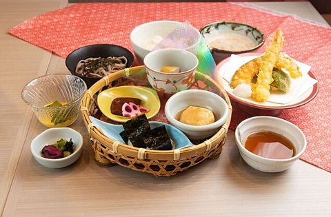 ●花かご4種【自然薯刺身・山芋饅頭あんかけ黒胡麻豆腐・焼き魚】●天ぷら盛(海老1本・野菜2種) ●信州冷そば(小)●自然薯とろろ汁(ハーフ) ●麦ご飯 ●香の物●抹茶わらびもち&冷製フォンデュ