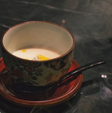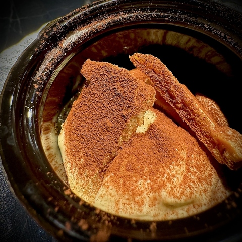 当店では、デザートにもこだわっております。なかでも「燻製の塩プリン」は、コースのデザートの一つとして通年ご提供しております。下は滑らかなミルクプリンで、上にはオリーブオイルと竹隅の黒い塩を使用。さらに、燻製の煙で香りをまとわせ、驚きの味わいをお楽しみいただけます。
