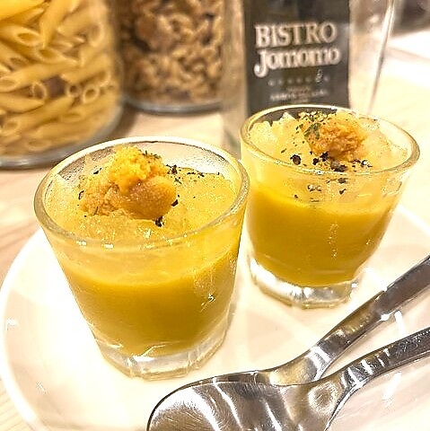季節の野菜をまろやかムースに。コンソメジュレをかけたあとはちょっとだけ贅沢にウニやカニをのせています。