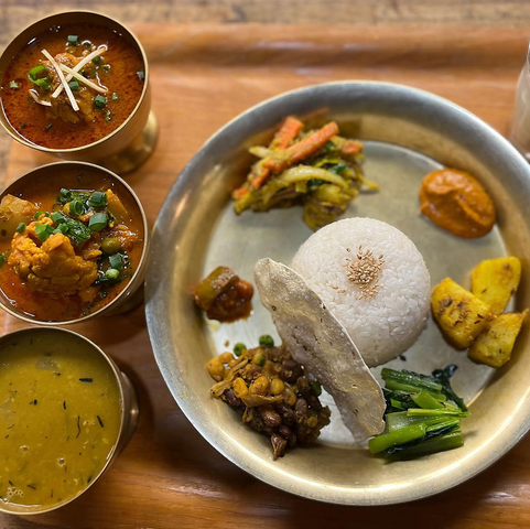 ネパール料理の定食メニューです!豆のスープ(ダル)とご飯、様々な副菜がセットになったお料理です。一皿でお腹いっぱいになり、野菜もとれて栄養満点です!