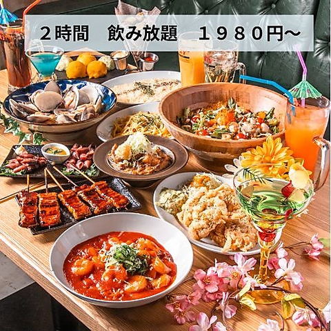 2時間飲み放題1980円!飲放込コースは嬉しい2名から利用OK4400円~♪18時半までハッピーアワー1杯110円も◎