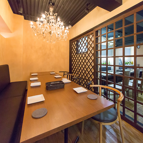 店内には使い勝手抜群なテーブル席をはじめ、プライベートなご宴会に最適◎シャンデリアのあるシンプルで癒やしの雰囲気半個室に変更をお願い致します!貸切は50名様~60名様までOK☆会社宴会や同窓会など各種ご宴会にぜひどうぞ◎