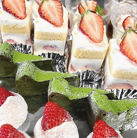 季節に合わせたいちごスイーツなど、スイーツセットやイベントを開催中します。ランチに+550円(税込)でデザートバイキングを追加可能で、ドリンクは別途となります。デザートバイキングのみの場合は1100円(税込)でワンドリンク付き。全6品程度の中からお好きなスイーツをお選びいただけます☆