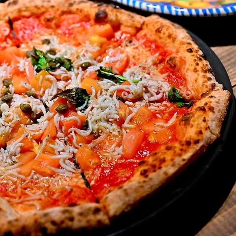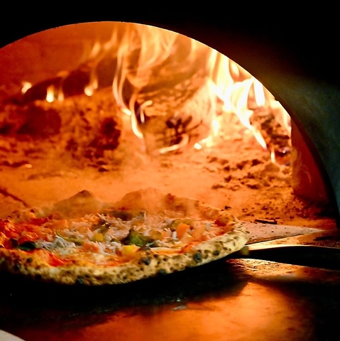 去年ピッツァ大会全国2位の実力!国産全粒粉2種を絶妙にブレンドした生地を500度の薪釜でわずか90秒で焼き上げ、香ばしさを凝縮。某有名アニメの音楽とイタリア絵本に囲まれたおしゃれでかわいらしい店内で、ワインやビールのお供に、この熱々焼きたてを召し上がれ!