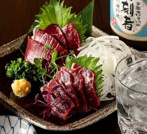 鮮度高くお召し上がりいただけるよう素材から厳選◎口に入れた瞬間に感じる脂の甘さ…。二口目には、たっぷりの刻みネギやおろしにんにくと一緒に食べれば、日本酒の肴に間違いない!良質たんぱくでヘルシーな今話題の馬刺し。程よい霜降りで滑らかな甘みを味わえます。