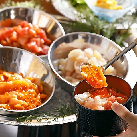 海鮮をお好きな量で自由に盛り付けていただき、自分だけの特別な海鮮丼をお作りいただけます。お好みに合わせた組み合わせで、贅沢な味わいを心ゆくまでご堪能ください。〈以下から3種類〉サーモン、いくら / 鮪、とびっこ / 小柱、甘海老