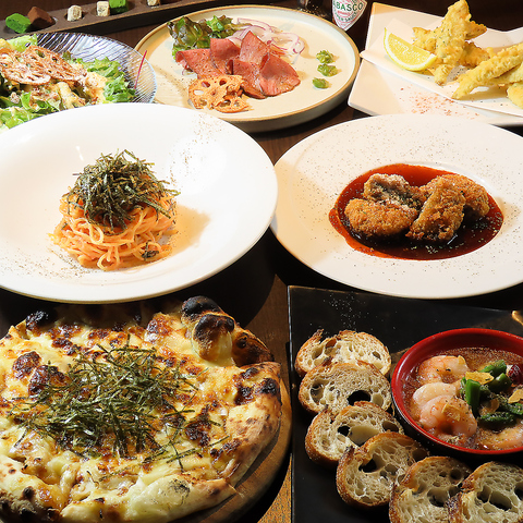 前菜、アヒージョ、ピザ、パスタなどを含んだ6品。120分飲み放題(L.O.30分前)も付いたお得なパーティーコースです。※写真は一例です。