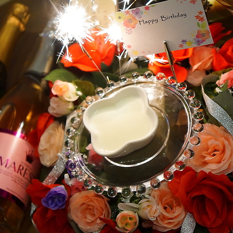 お誕生日やお祝い事、歓送迎会の主役へ、ブーケで彩ったメッセージ付きドルチェプレートが人気です。事前ご予約で通常1518円⇒550円!コース料理ご予約で無料でご提供!