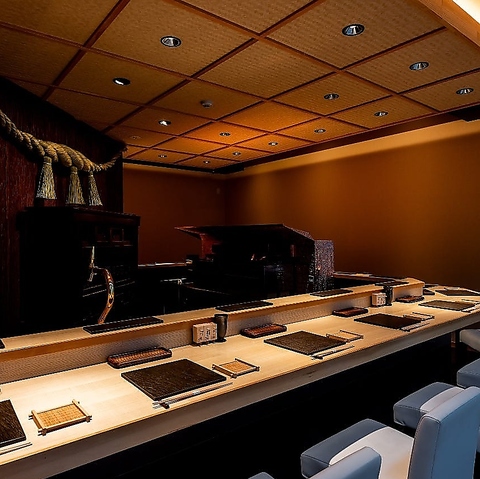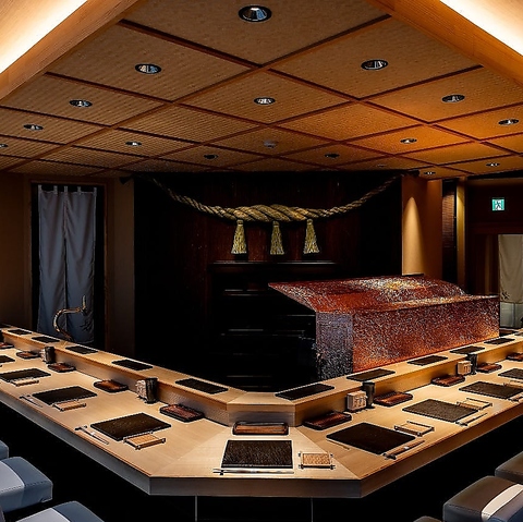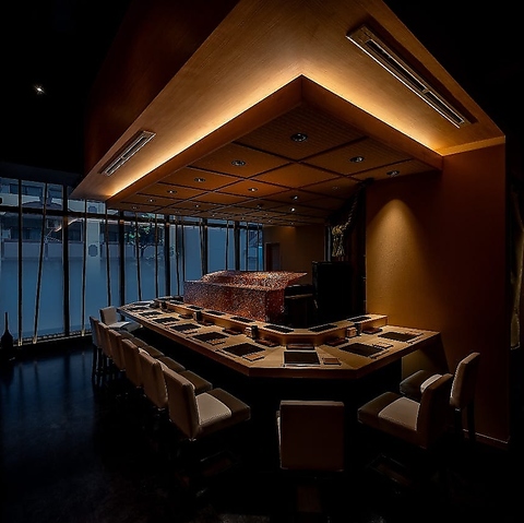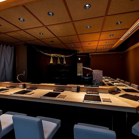 特別な一席に相応しい上質空間♪ライブ感溢れるカウンター席は、1名様~16名様までご利用いただけます。目の前で繰り広げられる料理の技、食材の豊かな香り、揺らめく薪の炎が五感を刺激。萬丸上ノ間での食の体験をより良いものにします。2人横並びで座って会話を楽しめるので、特別な一席にもおすすめです。
