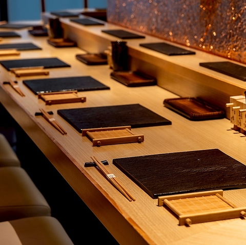 大人の隠れ家で食事と会話を楽しむ◎メイン通りから少し離れたビルの2階にひっそりと佇む、大人のための隠れ家的空間『萬丸 上ノ間』。店内はブラウンを基調に、やや落とした照明で落ち着いた雰囲気を演出。全席カウンターのつくりは、肩を並べてゆったり語らう接待や大切な人との時間にも最適です。