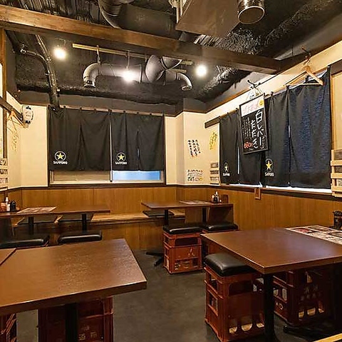 店内は、どこか懐かしさを感じる昭和酒場のようなレトロ感で、初めての方でも気軽に入りやすい温かい雰囲気です。カウンタ―席とテーブル席があり、お一人様からご友人、仕事仲間など、どなたでもリラックスして過ごせるアットホームな空間です。活気に溢れた店内で、美味しい串焼きや鮮魚を囲んで楽しいひとときをお過ごしください。