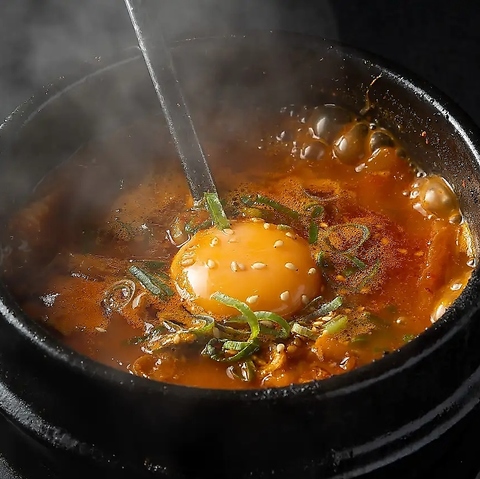白菜、ネギ、豆腐、牛テール、さらにあさりも入った具だくさんのスンドゥブです!トッピングも充実♪ホルモンを追加で旨さ倍増!当店おすすめは納豆!ぜひお試しください◎