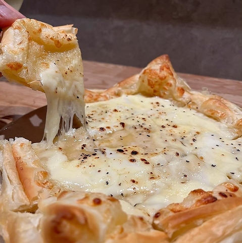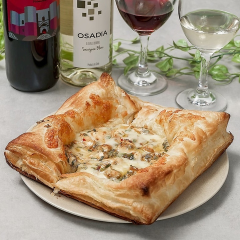 発酵バターを使用したサクサクのパイ生地に、ゴルゴンゾーラのコクと塩味、はちみつのやさしい甘さを合わせた人気の一枚。甘さと旨みのバランスが絶妙で、ワインとの相性も抜群。シェアしても、一人占めしても大満足の逸品をお楽しみください!