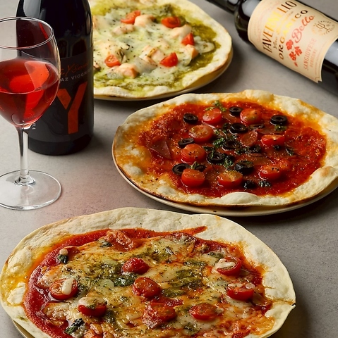 前菜盛り合わせから始まり、人気の各種パイピザ、カルパッチョサラダ・アヒージョを揃えたデート・女子会を楽しんでいただけるプランです。※パイピザは、ハニーゴルゴンゾーラ・ビスマルク・ラー油とクリームチーズの3種類から1種類お選びいただいてます。