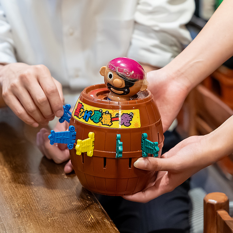 【黒ひげ危機一髪チャレンジ】樽から黒ひげが飛び出せば、次回使えるドリンク無料券をプレゼント!運試しに挑戦して、楽しいひとときをお過ごしください。皆様のご参加をお待ちしております☆