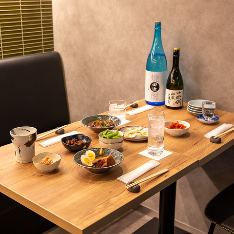 目の前には色とりどりの焼酎が並ぶカンター席。店員との会話が心地よく、料理の話やおすすめの酒を楽しみながら、ゆっくりと時間が流れるてゆきます。美味しい一品を味わいながら、温かな雰囲気に包まれる特別なひとときをお過ごしください。
