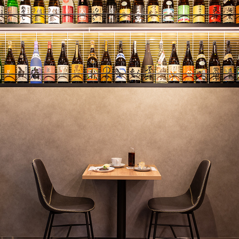 店内はシンプルで落ち着いた雰囲気。壁一面に並ぶ全国各地の焼酎ボトルが、訪れる人々の目を引きます。温かみのある照明が、焼酎の色合いを優しく照らし出し、心地よい空間を演出。テーブル席はゆったりとしており、友人や仲間と共に特別なひとときを楽しむのに最適です。