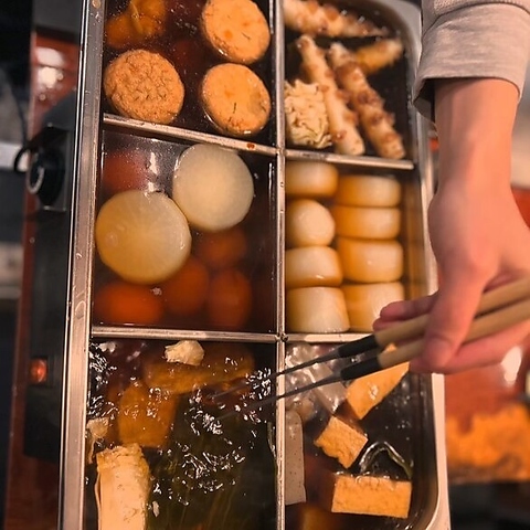 じっくりと時間をかけて丁寧に引いた自慢の出汁で煮込んだ、当店こだわりの「おでん」。お好きな具材を1品から気軽にオーダーOK!迷ったら定番人気の4種盛りや、店主厳選の6種盛りもどうぞ。最後は、香りと旨味が凝縮されたおでん出汁で割った「出汁割り」で心まで温まる粋な〆を…。