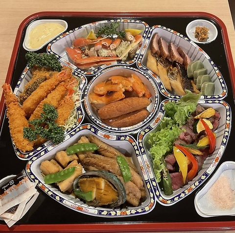 アワビの旨煮、黒毛和牛のローストビーフ、本ズワイ蟹など旬と旨みをぎゅっと詰め込んだ特別な一折。1年のご褒美にふさわしい、華やかな味わいをお届けします。ご予約は5日前迄にお願いします。※3人前からご予約可能です(1人前3000円~)※写真は4人前で12000円(税込)※内容は仕入れによって変更あり※ご予約の受付は12/25迄
