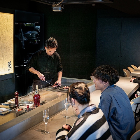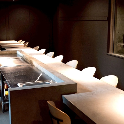【カウンター席】お一人様からご利用いただけるカウンター席。目の前には鉄板があり、オープンキッチンならではの臨場感とライブ感を味わえます。