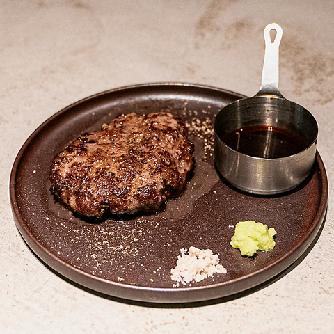 白老和牛と美瑛和牛を挽いて練り上げた和牛ハンバーグ。自家製のステーキソースとすりたての本わさび、藻塩とともにお召し上がりください。