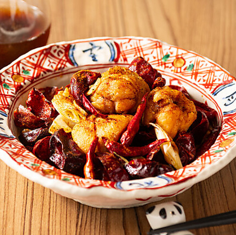 中国四川省発祥の料理で揚げた鶏肉と大量の唐辛子とスパイスで 炒めたお酒に合う一品です。