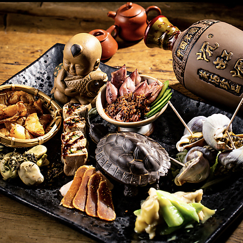 姫サザエのニンニク醤油漬けや枝付き枝豆の紹興酒漬け、トウモロコシのシェンダン天ぷらなど名物料理を堪能できる盛り合わせございます!