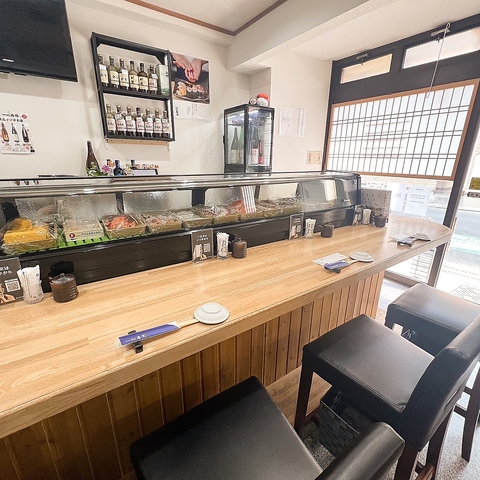【カウンター席】シンプルで温かみのある木製カウンター席をご用意。開放感が漂いつつも落ち着いた空間で、新鮮なネタを目の前にゆっくりと料理をお楽しみいただけます。友人や一人でも気軽に立ち寄れる居心地の良いお席です。