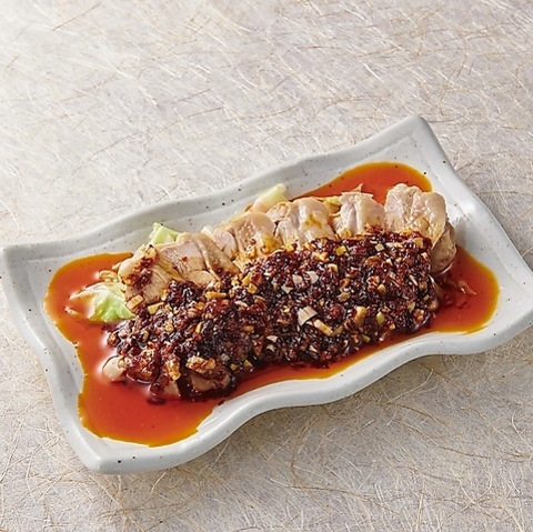 蒸した鶏肉にザクザクした食感の食べるラー油をかけました。やみつきになる辛さと旨さです。