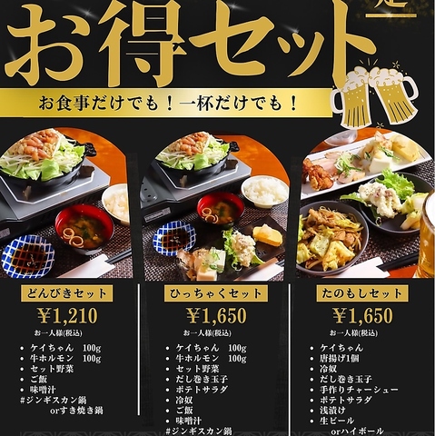 ホルモン焼きと、群上名物けいちゃん焼きがどちらも楽しめるお得なコース。90分飲み放題付きで、各種お料理とお酒を気兼ねなく楽しんでいただけます。たっぷりの野菜とホルモン、鶏肉と味噌たれの旨味が凝縮したお鍋はお酒との相性も◎おつまみになる一品メニューもあり、ボリューム感満点のオススメコースです♪