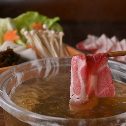 沖縄のあぐー豚を使った絶品しゃぶしゃぶ!!当店のしゃぶしゃぶは食材の鮮度と風味を最大限に引き出し食材の旨味を閉じ込めさっぱりとした味わいが特徴となっておりますので様々な食べ方(シークワーサーポン酢、ゴマだれ、レタス包み、厳選薬味)で色んな味を楽しんで頂けます。
