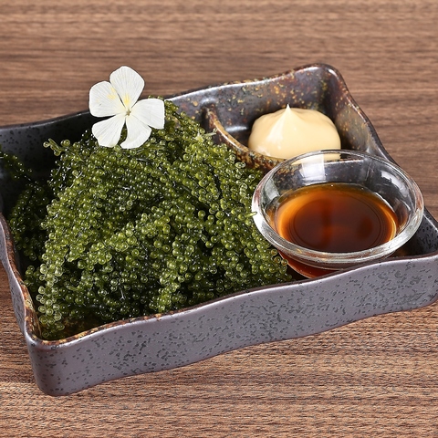 本場沖縄を堪能して頂く為に、素材にこだわったお料理も沢山ご用意しております。特に海ぶどうは産地直送後海水の水槽で育て直しておりますので沖縄で食べるプチプチ感もそのままで感動レベル!もずく酢も沖縄県で一番塩抜きのいい所のを使用してますので歯ごたえも抜群となっております。