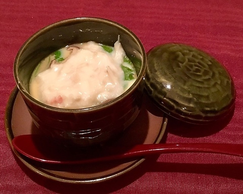 開店当初からの定番メニューである【うずら卵の蒸し穴子巻き巻き】。明石の穴子をうずら卵に巻いて、甘めの醤油出汁でじっくりと蒸し煮にしたこだわりの逸品です。