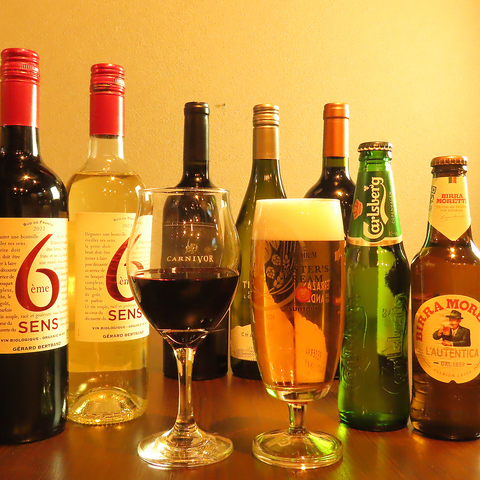 当店ではビール、ワイン、カクテルといったドリンクも多くご用意!料理にマッチしたドリンクをお選びいただけます。一人飲み、お二人での乾杯、飲み会、宴会に是非ともお使いください!ボトルワインも3000円のリーズナブルなものから、通も唸る本格的なものまで多数ご用意しております!
