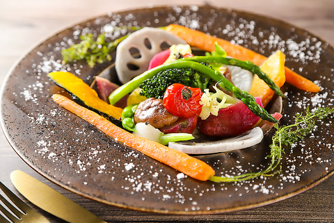 シェフが毎朝豊洲市場で仕入れる旬の野菜をじっくりスチームロースト。野菜本来の甘みを、沖縄の海塩でシンプルにお召し上がりください。