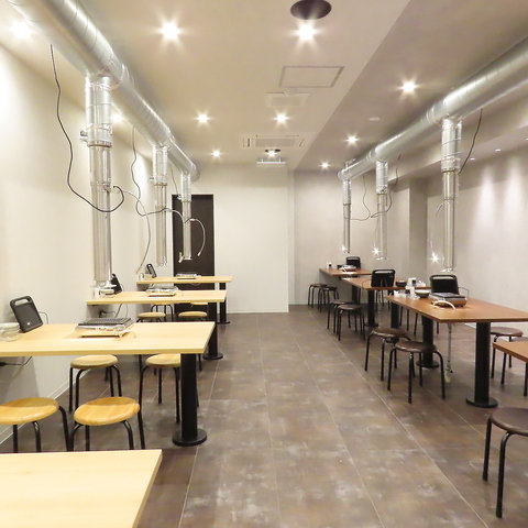 壁沿いにテーブル席をご用意しております。各テーブルはゆったりとした間隔が確保されており、周りを気にせずに焼肉をお楽しみいただけます。友人や家族との楽しい食事や特別なひと時を心ゆくまで堪能できます。落ち着いた照明と心地よい音楽が流れる空間です。