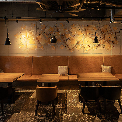 コンクリート調の壁に描かれたスタイリッシュなアートと、温かみのあるオレンジの照明が絶妙に調和。ゆったりとしたレザー調のソファ席は、健康的な食事を楽しみながら会話も弾む、落ち着いたデザインが魅力です。都会的でありながらも、どこか隠れ家のような安心感があり、贅沢なひとときを演出します。