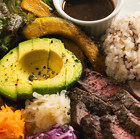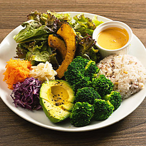 肉や魚のメインを選べる、ボリューム満点のヘルシープレートが自慢です。国産鶏ムネ肉やサーモンなど、厳選食材を体に優しい調理法で仕上げ、彩り豊かな自家製ナムルやマリネをたっぷりと添えました。雑穀米は大盛り無料で、しっかり食べたい男性も大満足!栄養バランス抜群の一皿で、至福のランチタイムを。