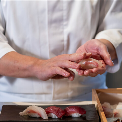 カウンター内にいる寿司職人がお客様の目の前で寿司を握ります。目の前で繰り広げられる職人の匠の技。一貫ごとに変わる表情、香り、そして味。ただ食べるだけではない、“体験する”カウンター席限定の寿司コース「縁(えにし)」もご堪能ください。