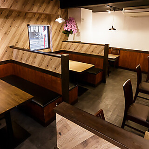 店内はどなた様もリラックスして過ごせる、落ち着いた雰囲気。木目と白を基調とした、清潔感ある空間です。奥側の広々としたテーブル席は、大切な方や気の合う仲間との語らいにもぴったり♪最大50名様まで貸切予約も可能です。各種宴会にもぜひご利用ください!