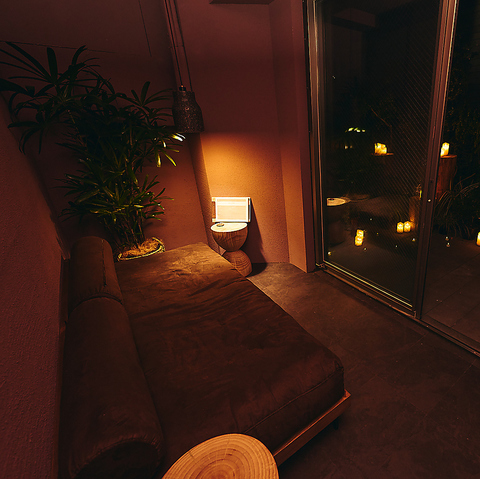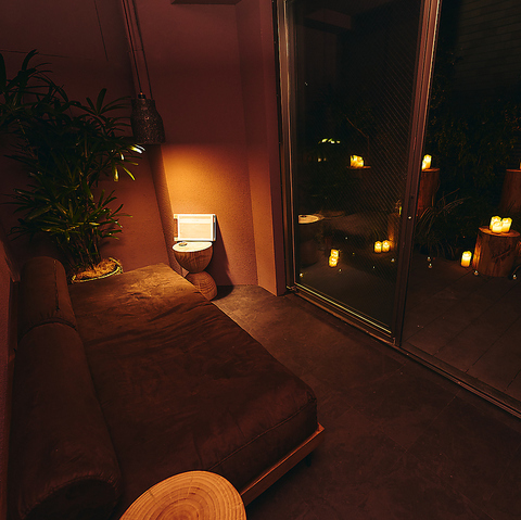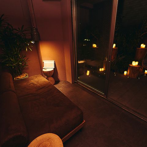 2名様用の小個室にはテラスが併設され、揺れるキャンドルの灯りを眺めながら過ごす一時。