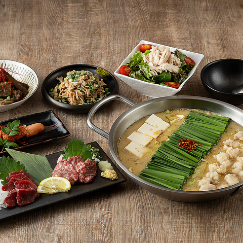 博多もつ鍋と「おおやまこだわり逸品」に、人気の馬肉料理を堪能できる豪華なセットメニューです。