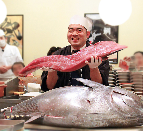 毎月恒例の生本まぐろ解体ショーでは、目の前で職人が大きな本まぐろを捌く迫力ある姿を楽しめます。お客様の目の前で大きな本まぐろを捌いていく様子は迫力満点。握りたてをお召し上がりいただくのはもちろん、珍しい部位も食べることができるのは、解体ショーならでは!まぐろ問屋直営店ならではの種類豊富なまぐろと美味しさをお届けします。