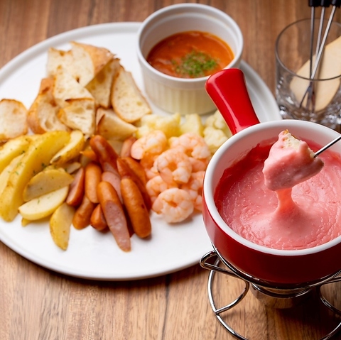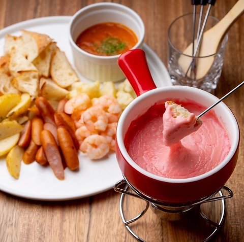 見た目も可愛いピンクのチーズフォンデュは、ビーツで色づけた特製チーズを使用。濃厚な味わいと華やかな彩りで、女子会やデートにもぴったり!