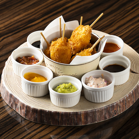 居酒屋パブリック名物串カツバラエティセット7種ソース盛りチェダーチーズ、四川チリソース、メキシカンサルサ、しば漬けタルタル、麻辣(マーラー)ソース、アボカドディップ、黒酢ソースで味変が楽しめる。もちろん秘伝の串カツソースも一緒に楽しめます。